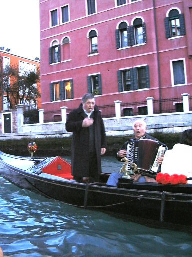 さていよいよ楽しみにしていたゴンドラ出発です。この3人がとってもイケて たのに、顔が写っていません。藁 こんな風に歌手とアコーディオン弾きが 乗ります。とってもお茶目で歌も演奏も上手♪日本人へのサービスのつもりで 「ブルーライトヨコハマ」を歌ってくれたのにはいささか閉口したけど、カン ツォーネは最高でした。 |
